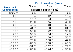Table of Ablation Depth vs. Diopters & Diameter of Optical Zone